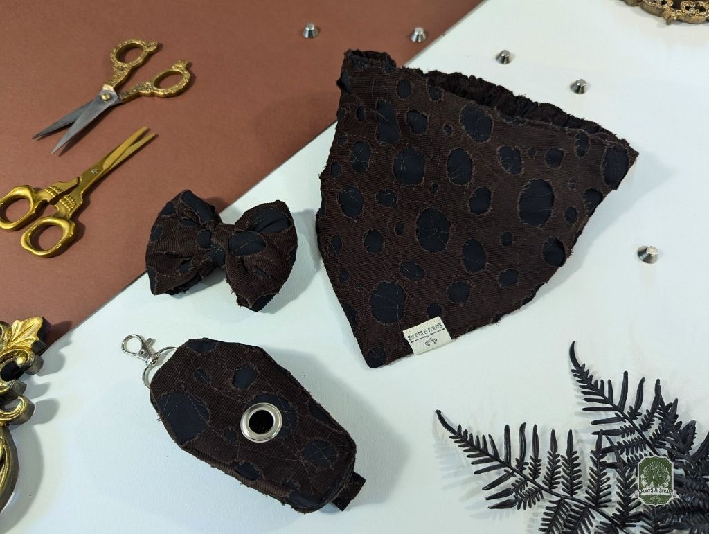 Ragged Brown Matching Set | Elastic Dog Bandana + Bow Tie + Poo Bag Holder | Dog Essentials Bundle