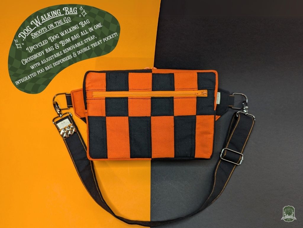 Snoots On The Go | Upcycled Dog Walking Bag | Black & Orange Rectangle Checks Patchwork