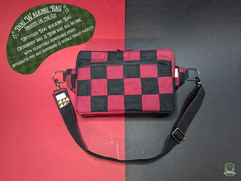 Snoots On The Go | Upcycled Dog Walking Bag | Burgundy Red & Black Checkerboard