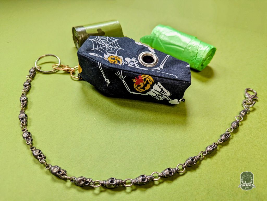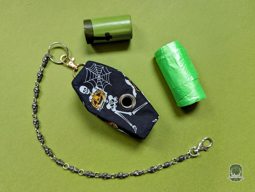 This Coffin shaped Poo Bag Holder is super cute and so useful you'll be even more scared to forget your waste bags for your walkies! Made with deadstock and salvaged fabric from landfill, vintage zippers and lots of added spooky vibes.